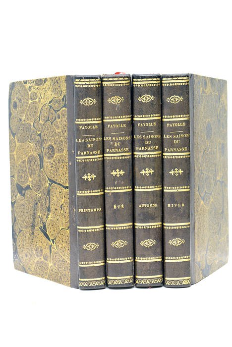 4 tomes en 4 volumes. Frontispice. 334 pages. + Frontispice. 332 pages. + Frontispice. 332 pages. + Frontispice. 332 pages. (17x10 Cm). Demi-veau de l'époque. Dos lisses ornés. Edition Originale de ce recueil de pièces du poète et grand amateur de musique, Jean-François Marie Fayolle. Composé notamment de plusieurs articles relatifs à la musique, le recueil est divisé en 4 parties correspondant chacune à une saison de l'année. Elles forment la dernière année d'une publication périodique publiée sous ce titre entre 1805 et 1809, et composée au total de 16 parties. Imprimé sur papier vergé, l'ouvrage est illustré de 4 frontispices allégoriques gravés par Charles-Etienne Gaucher d'après Letellier. Signature de l'auteur au verso de trois des faux-titres et ex-libris ancien, sur les pages de titre, "J.P. Joubert-Bonnaire. Il s'agit sans doute de Jean-Pierre Joubert-Bonnaire qui fut maire d'Angers. Bel exemplaire, agréablement relié.