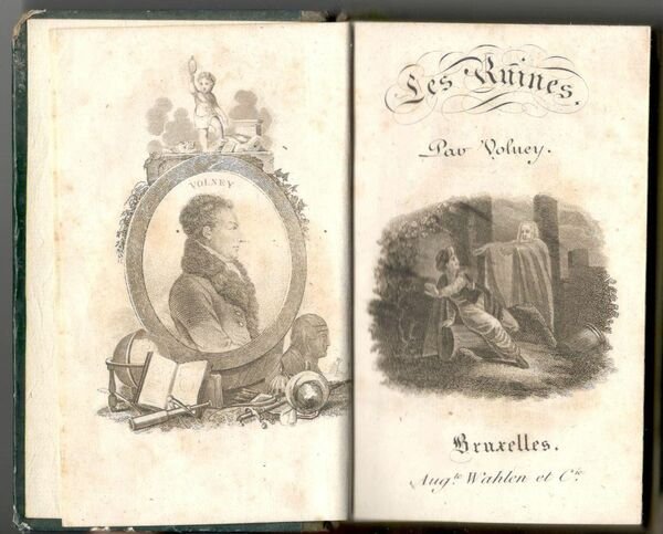 In 24° (cm. 14,5 x 8,5), pp. xxi, (1), 390. Leg. mezza pelle dell’epoca. Dorso liscio con filetti oro e titolo su tassello. Leggera brunitura. Copia in buono stato. Antiporta con il ritratto dell'autore e un frontespizio figurato. Volney, a seguito di un viaggio in oriente, riflette sulle rovine dei grandi imperi, sull’ origine delle antiche religioni, sul culto degli astri.