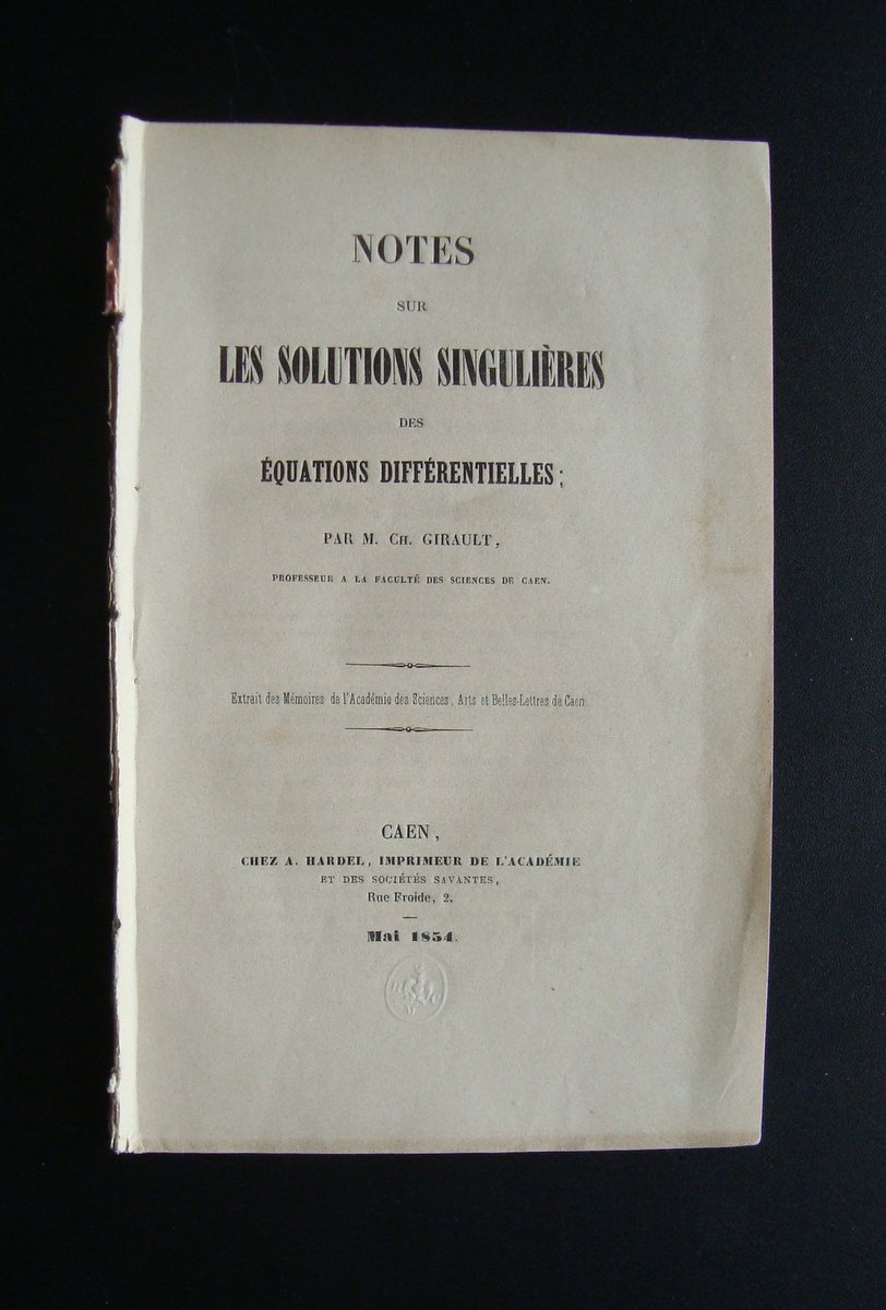 Opuscolo, Notes sur Les Solutions Singulieres des Equations Differentielles par M. Ch. Girault professeur a la Facutè des Sciences de Caen Caen, 1854, cm 21x11,5, pp. 21; brossura ed. Condizioni di conservazione. Esemplare in buono stato con leggere tracce d'uso e del tempo, brossura anteriore mancante, dorso con abrasioni e piccole mancanze. OPEB.4152 BLU
