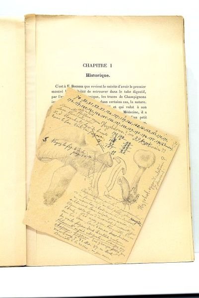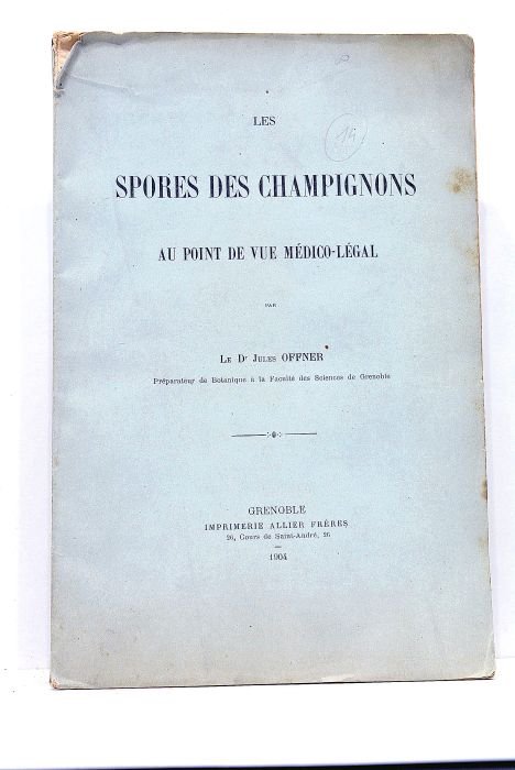 in-8. VI. 67pp. 2 planches hors-texte. 1f. Broché, couverture imprimée (petite déchirure à la coiffe supérieure, mouillures aux plats). Exemplaire non coupé. Papier légèrement bruni. Bon exemplaire à l'intérieur. Etude consacrée aux champignons avec un chapitre sur "les empoisonnements accidentels et criminels". Envoi autographe de l'auteur: "A M. le Dr. Flandrin, cordial hommage, Dr. J. Offner". Un petit feuillet couvert de notes manuscrites et de dessins de champignons a été glissé dans l'ouvrage.