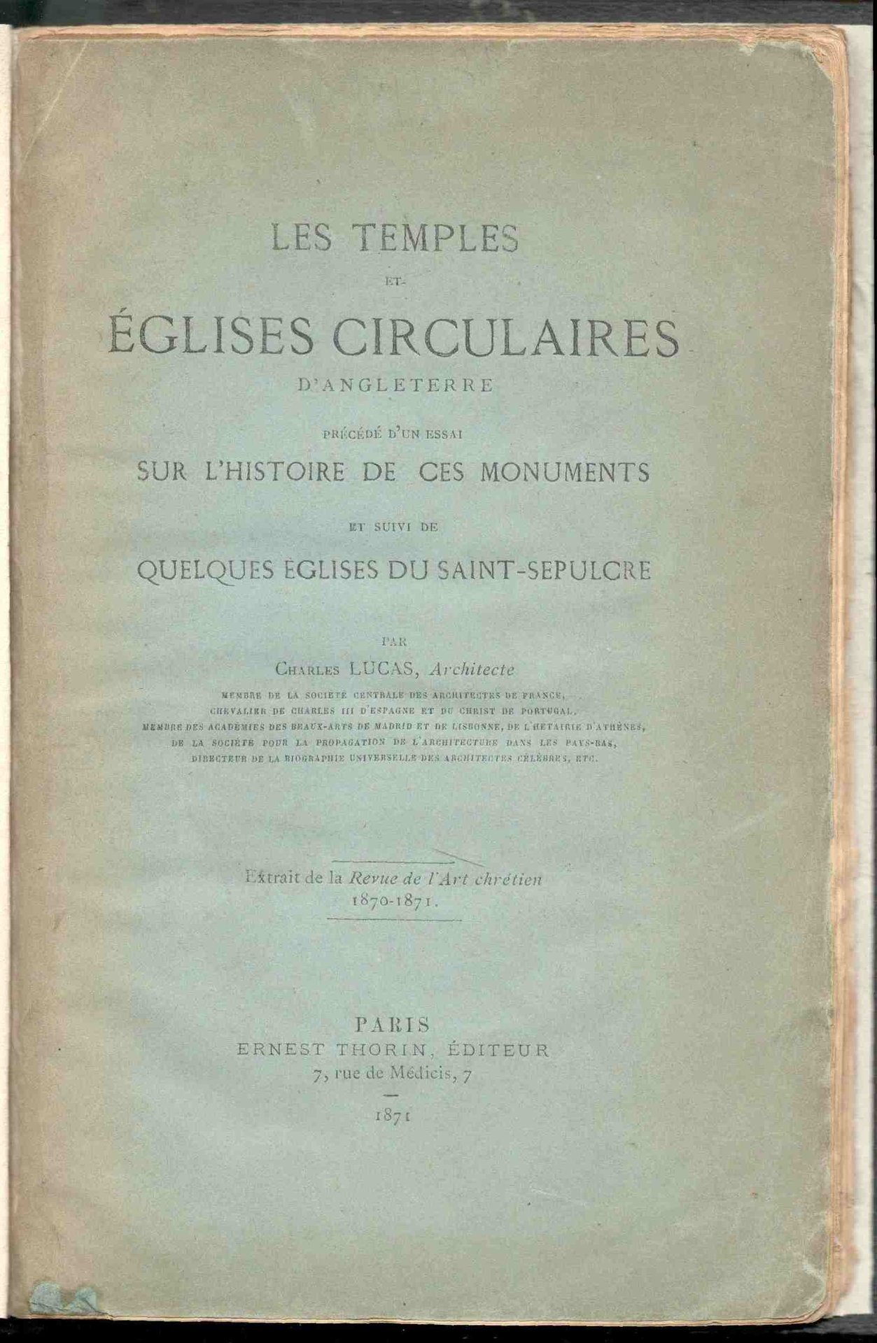 Les temples et églises circulaires d'Angleterre, précédé d'un essai sur l'histoire de ces monuments et suivi de quelques églises du saint-Sepulcre