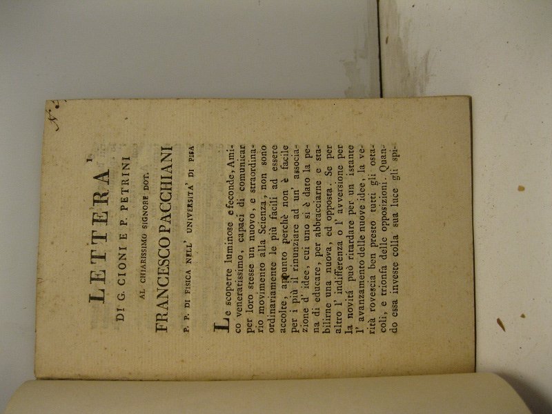 In 16, pp. 11 + (1). Br. muta. 'Queste due lettere scritte da due abili fisici tendono ad illustrare l'esperienze del Prof. Pacchiani, e la seconda di esse e' principalmente una replica alle objezioni ed esperienze del Prof. Mascagni. Attualmente questi due dotti Cooperatori vanno pubblicando una Memoria sull'azione dell'elettricita' nella decomposizione dell'acqua, ove saranno riepilogati anche i fatti delle due suddette lettere.'. (Nuovo giornale dei letterati, Pisa, 1805, III, p. 461).