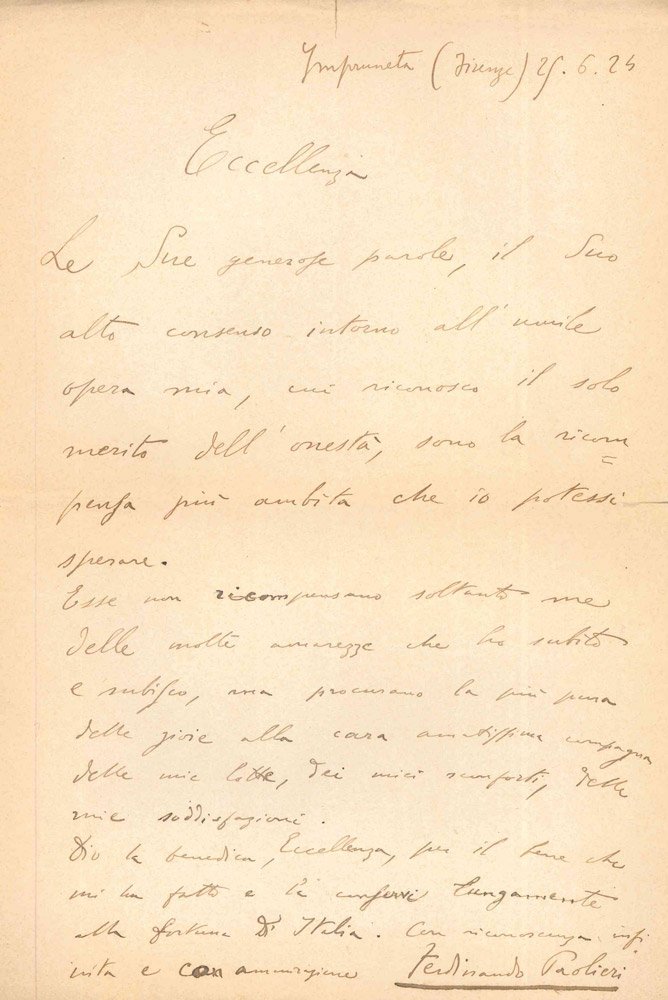 AUTOGRAFO Lettera autografa firmata. Non indicato il destinatario, ma la lettera proviene da un insieme di documenti di Paolo Boselli. Lievi strappetti perimetrali in corrispondenza delle piegature, ma ottimo esemplare. Ferdinando Paolieri (scrittore e poeta, oltre che giornalista della Nazione) scrive a Paolo Boselli (politico di lungo corso, più volte ministro, Presidente del Consiglio tra il 1916 e il 1917) per ringraziarlo delle parole di apprezzamento rivoltegli. ––– «Eccellenza / Le Sue generose parole, il suo alto consenso intorno all'umile opera mia, cui riconosco il solo merito dell'onestà, sono la ricompensa più ambita che io potessi pensare. Esse non ricompensano soltanto me delle molte amarezze che ho subito e subisco, ma procurano la più piena delle gioie alla cara amatissima compagna delle mie lotte, dei miei sconforti, delle mie soddisfazioni. Dio la benedica, Eccellenza, per il bene che mi ha fatto e lo conservi lungamente alla fortuna d'Italia. Con riconoscenza infinita e con ammirazione Ferdinando Paolieri».