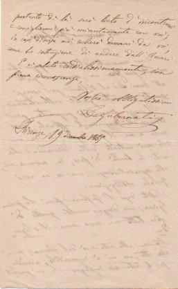 Lettera autografa firmata, datata 19 dicembre 1865 - Firenze, inviata ad un professore
