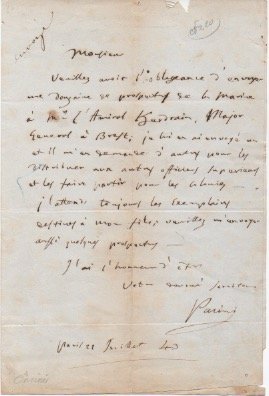 AUTOGRAFOPacini fu autore dell'opera "La Marine, Arsenaux, Navires, Equipages, Navigation, Atterrages, Combats […]" pubblicato a Parigi da Curmer nel 1844. " Veuillez avoir l'obligeance d'envoyer une douzaine de prospectus de la Marine à M er l'Amiral Kardrain, Major General à Brest; je lui en ai envoyé un et il m'en demande d'autres pour les distribuer aux autres officiers supérieurs et les faire partir pour les colonies. J'attends toujours les exemplaires destinés à mon fils; veuillez m'envoyer aussi quelques prospectus […] ".
