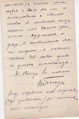 AUTOGRAFOLunga e interessante lettera in cui lo scrittore lamenta il poco tempo a disposizione per rivedere alcuni capitoli del suo romanzo. “ [.] autorizzando voi a togliere o modificare quelle poche battute di dialogo che potessero essere troppo ardite per un’appendice di giornale [.] finito questo secondo capitolo che tenete, il resto sarà tutto pubblicabile senza timore, perché i punti più difficili saranno superati [.]”.