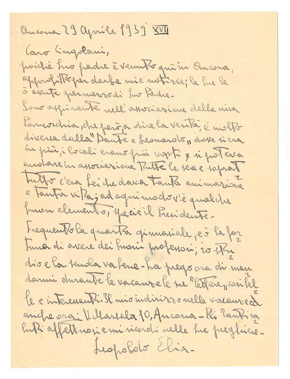 Lettera autografa firmata, inviata a Mario Cingolani
