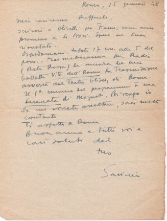 AUTOGRAFOLo scrittore comunica all'amico: “[.] dopodomani, sabato 17 corr. alle 5 del pom., trametteranno in radio (Rete Rossa) la musica del mio balletto Vita dell'Uomo. La trasmissione avverrà dal Teatro Eliseo di Roma. Il primo numero del programma è una Serenata di Mozart. Poi vengo io. Se mi vorrete ascoltare sarò molto contento [.]”.