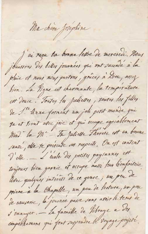 AUTOGRAFO Lettera di carattere familiare in cui Pellico racconta alla sorella del suo soggiorno a Vigne, della bellezza del luogo e della cordialità degli abitanti. Le sue giornate scorrono tra «un peut de priere à la Chapelle, un peut de lecture, un peut de causerie […]». -- Giuseppina Pellico fu maestra e superiora al Ritiro delle Rosine di Chieri. Donna colta e religiosa, dopo la morte del fratello Silvio ne eseguì le ultime volontà e ne curò il ricordo. Molte informazioni di carattere privato, relative al poeta, sono oggi arrivate a noi grazie ad alcuni quaderni autografi lasciati dalla donna.