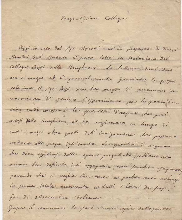 AUTOGRAFOAstronomo noto soprattutto per le sue "Tavole sul Sole", collaborò anche con il giornale "Il Conciliatore". A Carlini venne dedicato un cratere lunare nel Mare Imbrium. La missiva è relativa ad una relazione del collega Bossi sulle brughiere, ai problemi della loro irrigazione e ai costi di realizzazione.