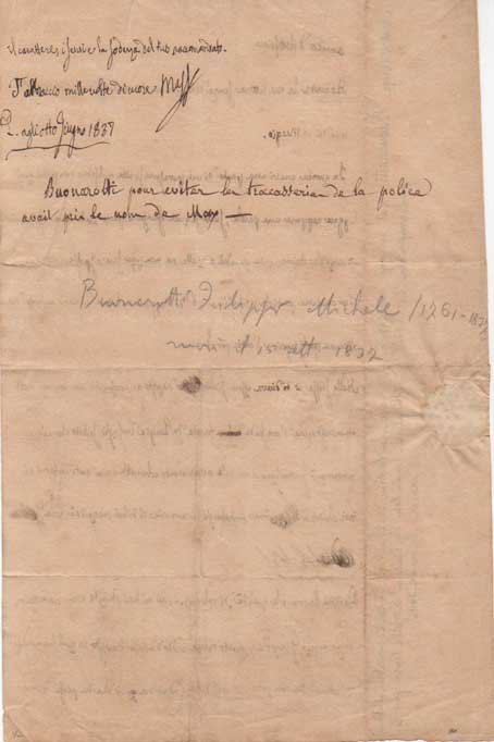 - 205x134 mm. 1 carta, scritta recto e verso. Manoscritto a inchiostro nero. Traccia di sigillo. Sulla carta anche alcuni commenti in lingua francese scritti da altra mano. Altra indicazione biografica scritta a matita. Buonarroti abbracciò la causa rivoluzionaria, trasferendosi in Corsica, con lo scoppio della Rivoluzione Francese. Giuseppe Mazzini lo ricorda con queste parole: ”Era un uomo profondo, ma assai gretto […] era inoltre comunista”.