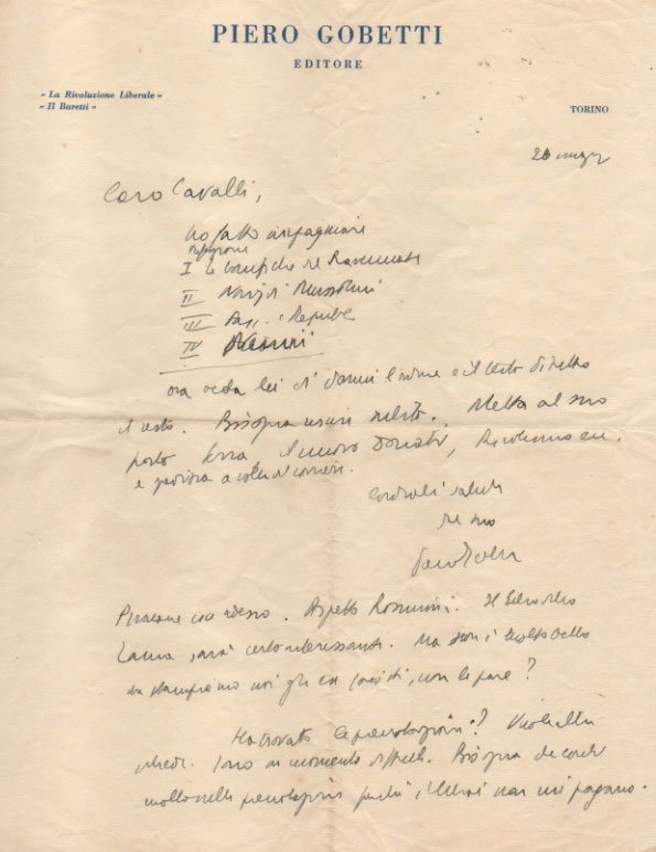 Lettera autografa firmata su carta intestata Piero Gobetti, indirizzata a [Armando Cavalli]