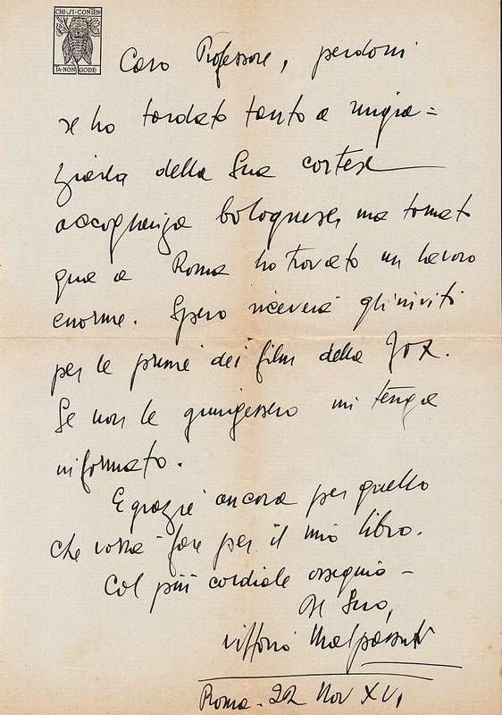 Vittorio Malpassuti, di nobile famiglia piemontese, fu scrittore, poeta, giornalista, sceneggiatore, drammaturgo e regista del doppiaggio italiano. Amico di D'Annunzio fino alla sua prematura scomparsa una decina di opere fra poesia e testi teatrali. Qui scrive al corrispondente (G. Lipparini) per ringraziarlo della 'cortese accoglienza bolognese', e conclude: '(.) Spero riceverà gli inviti per le prime dei film della Fox. Se non le giungessero mi tenga informato. E grazie ancora per quello che vorrà fare per il mio libro (.)'.