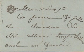 - 1 bifolio, scritte 4 pagine. Manoscritto a inchiostro nero su carta azzurra con monogramma dorato. Testo in italiano (con errori).