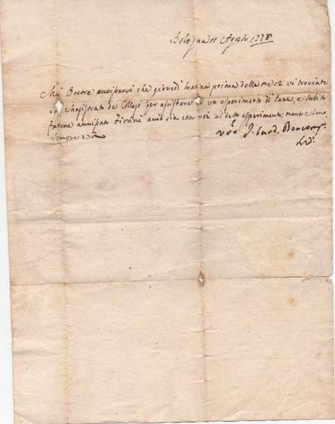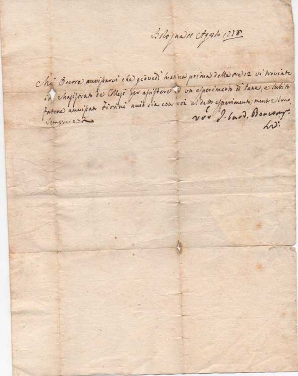 AUTOGRAFO ”Mi occorre avvisarvi che giovedì mattina prima delle ore 12 vi troviate in magistrato de Collegi per assistere ad un esperimento di Pane, e subito fatene avvisato Fiorini acciò sia con voi al detto esperimento […]”.