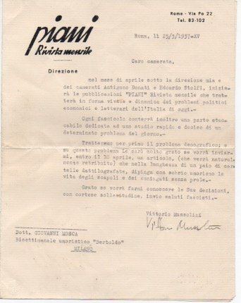 AUTOGRAFOVittorio Mussolini informa Mosca della nascita della rivista "Piani" che tratterà "in forma vivace e dinamica dei problemi politici economici e letterari dell'Italia di oggi. […] Tratterò per primo il problema demografico e su questo problema Le sarò molto grato se vorrà inviarmi […] un articolo […] dipinga con sobrio umorismo la vita degli scapoli e dei coniugati senza prole […]".