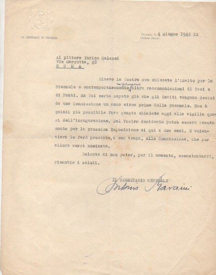 Lettera dattiloscritta con firma autografa, datata 4 giugno 1942 - Venezia, inviata al pittore Enrico Galassi.