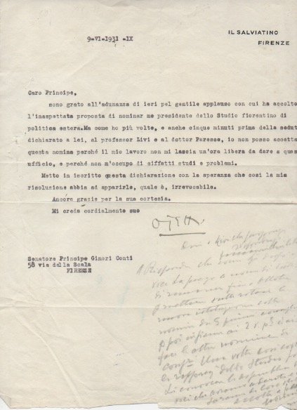 Lettera dattiloscritta con firma autografa, datata 9 giugno 1931 - Firenze, inviata al principe Ginori Conti.