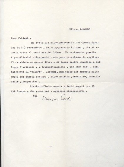 Lettera dattiloscritta con firma autografa inviata al poeta e giornalista Enzo Fabiani. Datata 24 giugno 1980