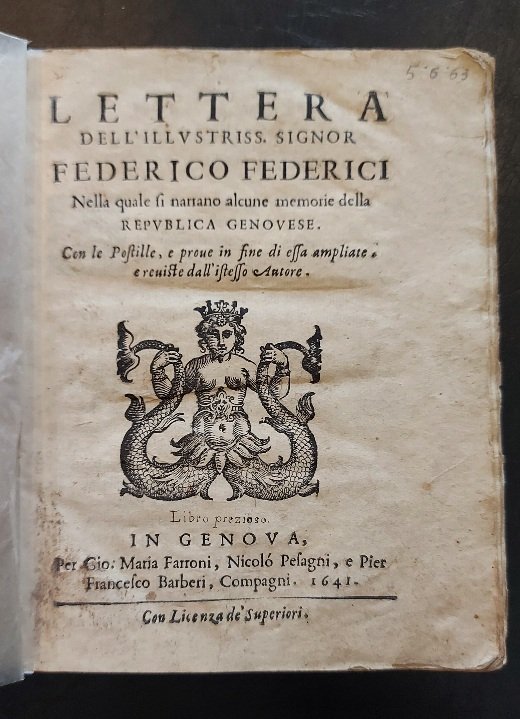 In 16 (cm 15 x 19), pp. (8) + 98 + (2 bianche). Qualche forellino alla quarta carta. Alcuni aloni alle ultime 4 carte. Scritta al frontespizio. Illustrazione xilografica al frontespizio raffigurante una sirena con doppia coda, e corona in testa, nell'atto di reggere con entrambe le mani le due code. Cartonatura antica rimontata. Seconda edizione (edizione originale 1634) di questa lettera di Federico Federici, erudito genovese vissuto tra il 1570 e il 1647, indirizzata a Kaspar Schoppe (Gaspar Scoppius), filosofo di origine tedesca che viveva a Roma ma che aveva soggiornato a Genova. Si tratta di una lettera celebrativa delle glorie genovesi. Interessante, a partire da pagina 31, il lungo elenco delle fonti storiche a cui ha attinto l'Autore per la redazione dell'opera. Lozzi, I, 2101, nota. Manno, VI, 22451. Piantanida, 783.