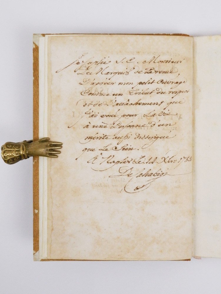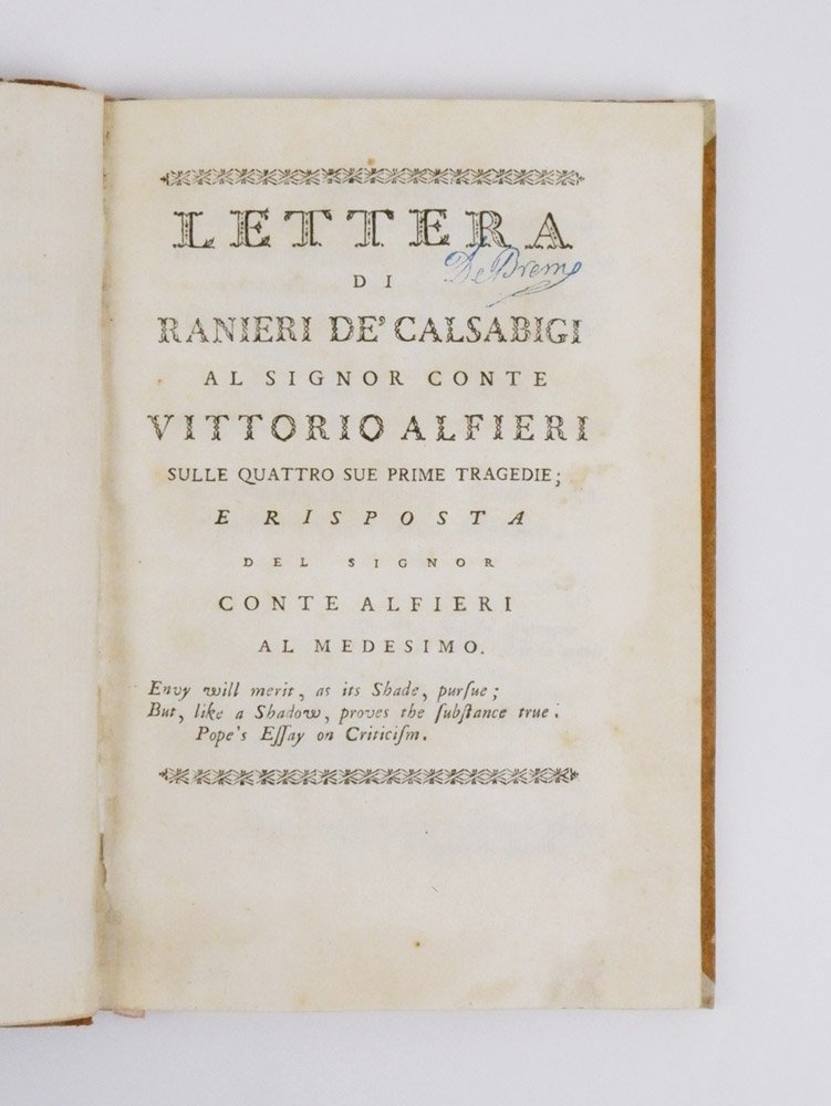LIBROEdizione originale.CON AUTOGRAFO.Ottimo esemplare, molto fresco (solo un lievissimo alone marginale al frontespizio). Provenienza di gran pregio: tra la prima e la seconda sguardia è legato un foglio con una lunga dedica autografa di Calzabigi a De Breme: «Je suplie S. E. Monsieur le Marquis de Breme d’agreer mon petit ouvrage comme un tribut du respect [.]. À Naples le 14 (?) Xbre 1783 De Calsabigi». Al frontespizio timbretto «De Breme»: Ludovico Giuseppe Arborio Gattinara conte di Sartirana marchese di Breme (Parigi 1754 - Milano 1828) svolse importantissimi incarichi diplomatici a Napoli, dove dal 1782 fu rappresentante del re di Sardegna, a Vienna e infine a Milano: qui, per volontà dello stesso Napoleone, divenne ministro degli Interni del Regno Italico tra il 1806 e il 1809. Fu padre del celebre letterato Ludovico di Breme.Lo scambio tra Calzabigi e Alfieri, pubblicato per la prima volta nella presente edizione e considerato uno dei più importanti documenti sul teatro italiano di fine Settecento, per la sua rilevanza venne più volte ristampato come prefazione alle Tragedie dell’astigiano. «Dopo aver sottolineato le cause della mancanza di lavori teatrali di genere tragico in Italia, [Calzabigi] fece una precisa analisi critica dei personaggi creati dall' Alfieri, dei quali sottolineava l'originalità pur facendo qualche riserva circa lo stile delle tragedie. L'Alfieri accettò serenamente le critiche, definendo l'analisi del C. "giudiziosa, ragionata e cortese" (C. Gabanizza, Dizionario Biografico degli Italiani, vol. 17, 1974). Raro, se ne contano una decina di esemplari nel catalogo Sbn.