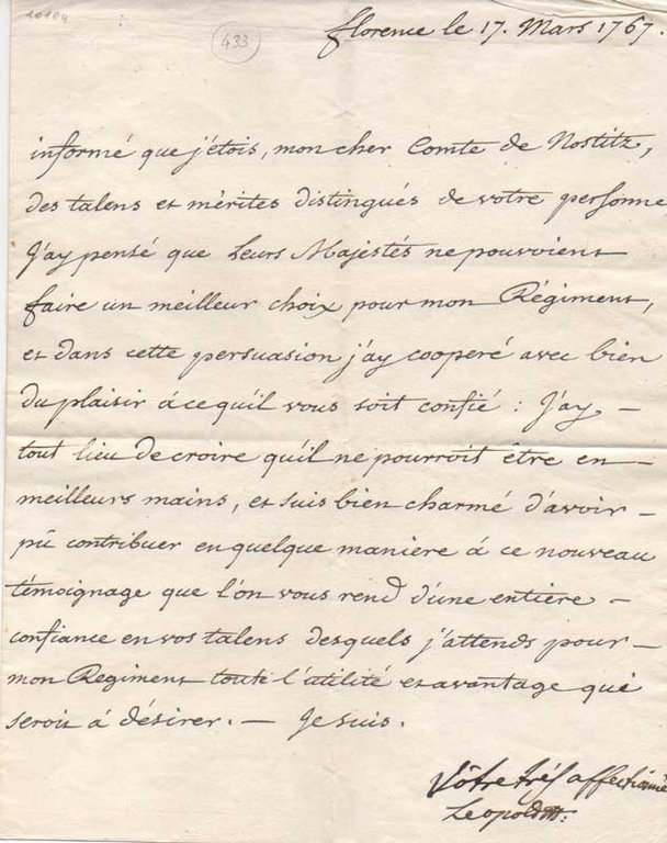 AUTOGRAFO “[.] j’ay tout lieu de croire quil ne pourroit etre en meilleurs mains, et suis bien charmé d’avoir pù contribuer en quelque maniere à ce nouveau témoignage que l’on vous rend d’une entire confiance en vos talens [.]”.