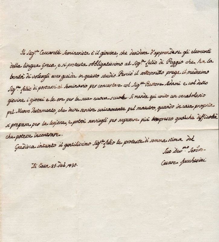 Lettera manoscritta e firmata, inviata a Lelio Di Poggio. Raccomandazione per ungiovane avviato allo studio della lingua greca.