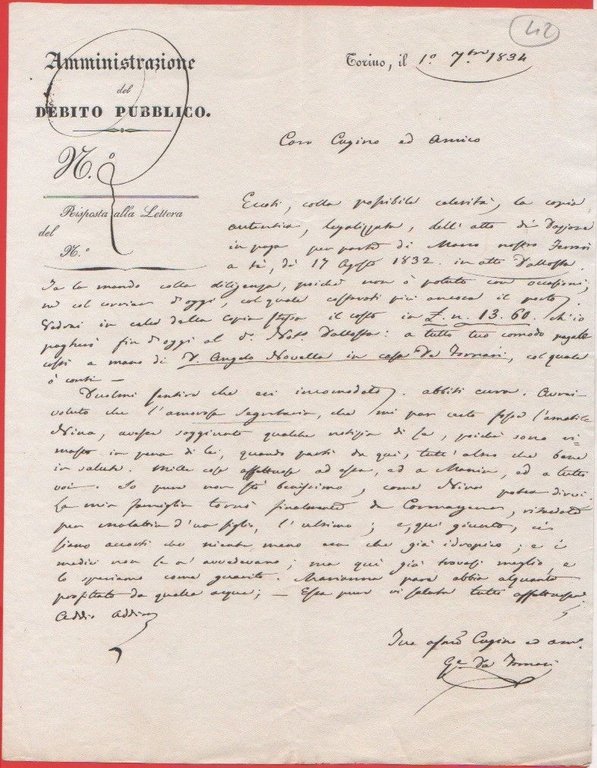 Lettera privata su carta intestata Amministrazione Debito Pubblico. Torino 1834
