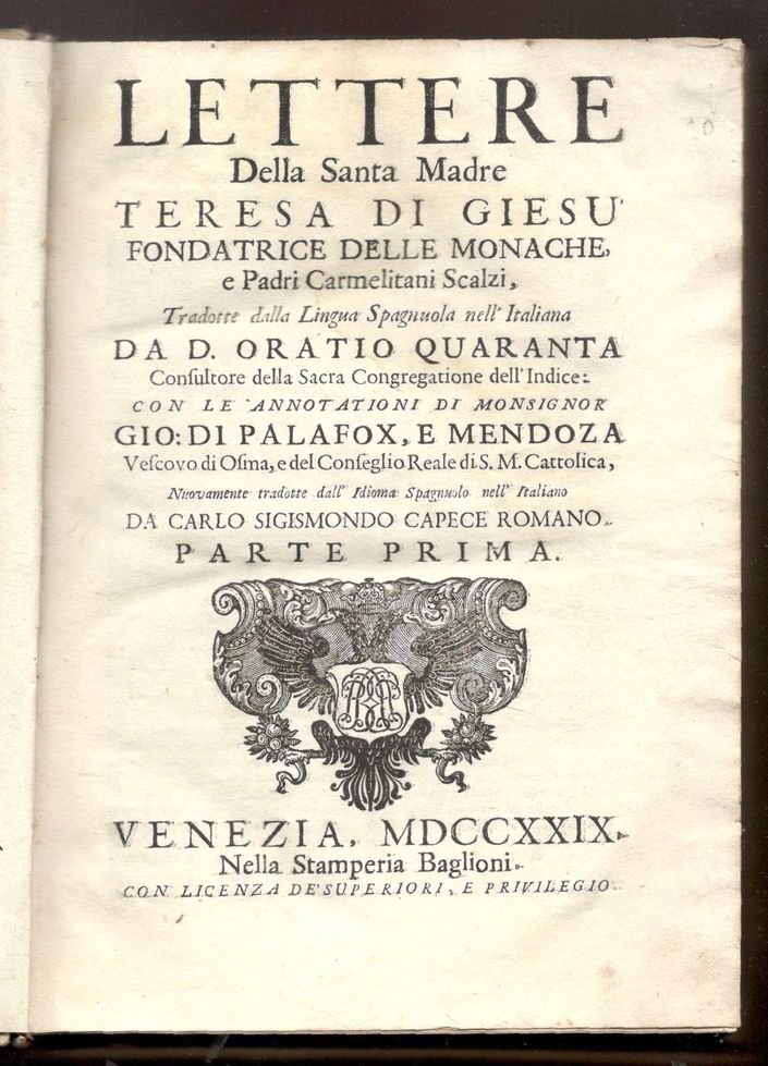 Lettere della Santa Madre Teresa di Giesù fondatrice delle Monache e Padri Carmelitani Scalzi. Tradotte dalla lingua spagnuola nell'Italiana da D. Oratio Quaranta. [.] Parte prima. Con le annotationi di Monsignor Gio. di Palafox, e Mendoza. Parte seconda, Con le annotationi del padre F. Pietro dell'Annunciata