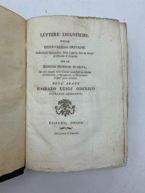 In 8 (cm 15,5 x 23), pp. XII + (2) + 214 + (1) di errata + (1 bianca) con 16 grandi tavole finali piu' volte ripiegate incise all'acquaforte con illustrazioni di stemmi, medaglie, scudi (le figure delle tavole sono accuratamente descritte nell'ultima parte del volume da pagina 196 a pagina 213). Leggera gora al margine centrale bianco superiore delle ultime pagine. Cartonatura coeva. Importante opera sulla storia delle colonie genovesi dell'Est suddivisa in lettere: dalla I alla XII dedicate alla storia e al territorio della Liguria, dalla XIII alla XVIII a Caffa, colonia genovese in Crimea, nelle quali sono analizzate le opere realizzate presso questo antico caposaldo commerciale. "Profondo ed eruditissimo scrittore, che pur delle patrie bisogne tratto' con dottrina, egli e' il padre Gaspare Luigi Oderico. Fu versatissimo nelle cose teologiche, e di queste professore in Roma; ma ottenne gran fama singolarmente per le sue estese cognizioni di storia, archeologia e numismatica." (Camillo Pallavicino, "Descrizione di Genova e del Genovesato", vol. 3, 1846, p. 58). Lichtenthal, Manuale bibliografico del Viaggiatore in Italia, p. 44, Zuccagni-Orlandini, Corografia fisica, storica e statistica dell'Italia e delle sue isole, vol. 2, p. XV. Manno, 27345. Platneriana, p. 18.
