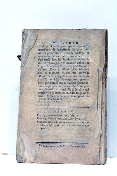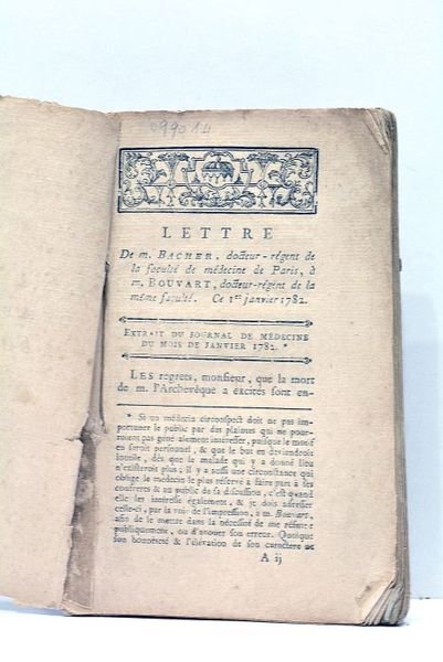 in-12. 112pp. Broché. Papier bruni. Feuillets écornés. Petits manques de papier au faux-titre. Quelques rousseurs. Controverse médicale au sujet du traitement donné à l'Archevêque mort d'hydropisie.