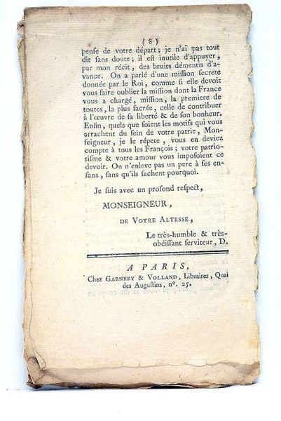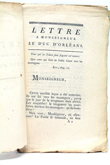 in-8. 8pp. Broché. Exemplaire non rogné, en partie non coupé. Petites salissures. Pamphlet contre le duc d'Orléans dans lequel il lui est reproché d'avoir quitté la France après les troubles d'octobre 1789. Révolution française.