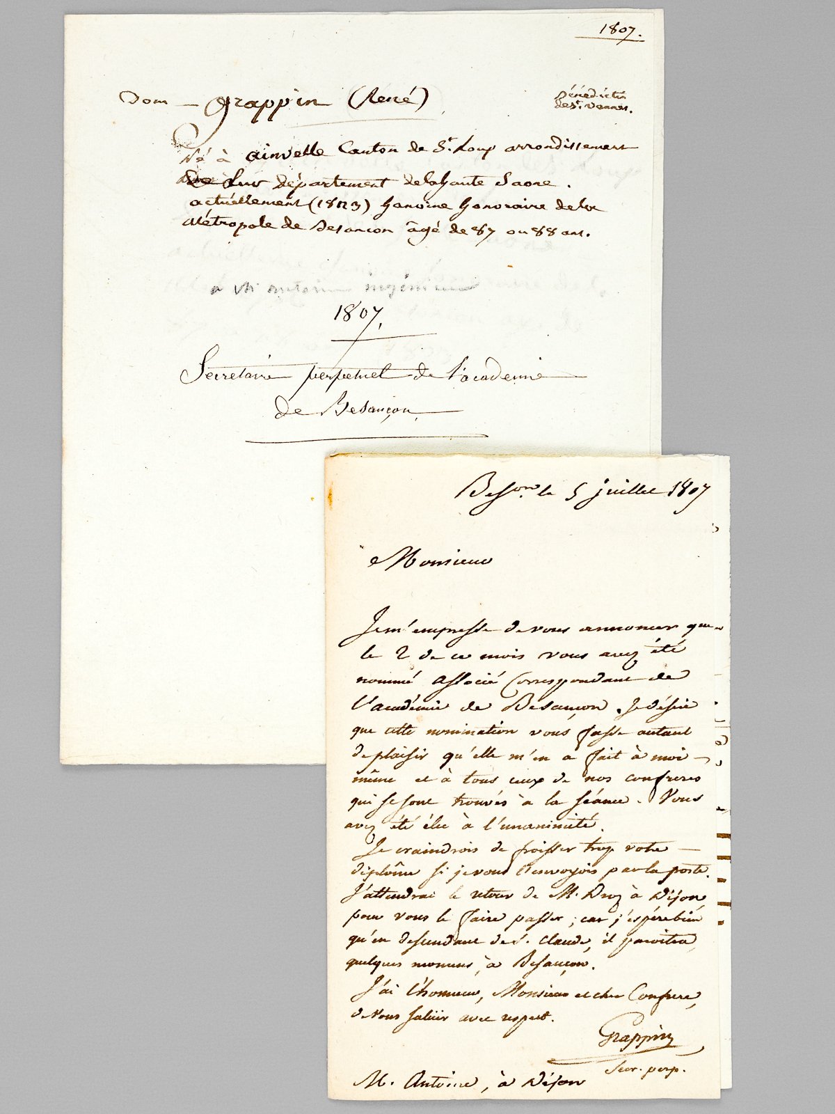 1 L.A.S. et un brouillon de réponse contrecollé à l'intérieur, conservé sous feuillet double : 1 L.A.S. d'une page datée de Besançon, le 5 juillet 1807, adressée à Dijon à M. Antoine, ancien ingénieur en chef des Ponts et Chaussées, membre de plusieurs académies : "Monsieur, Je m'empresse de vous annoncer que le 2 de ce mois vous avez été nomé associé correspondant de l'Académie de Besançon. Je désire que cette nomination vous fasse autant de plaisir qu'elle m'en a fait à moi-même et à tous ceux de nos confrères qui se sont trouvés à la séance. Vous avez été élu à l'unaminité [etc. ] ; [ On joint le brouillon de la réponse de M. Antoine ] Chanoine bénédictin, secrétaire perpétuel de l'Académie des sciences, belles-lettres et arts de Besançon et de Franche-Comté, Dom Grappin (1738-1833) fut prêtre jureur et est connu pour sa correspondance avec l'abbé Grégoire.