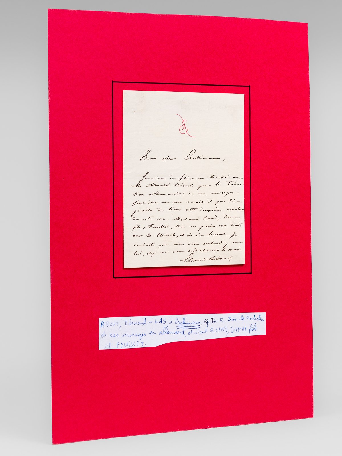 1 L.A.S. d'une page sur 2 ff. au chiffre d'Edmond About, lettre contrecollée en tête sur carton rouge (collection Claude Seignolle), non datée : "Mon cher Erckmann, Je viens de faire un traité avec M. Arnold Hirsch pour la traduction allemande de mes ouvrages. Peut-être ne vous serait-il pas désagréable de tirer cette deuxième monture de votre sac. Madame Sand, Dumas fils, Feuillet, tous vos pairs ont traité avec M. Hirsch, et ils s'en louent. Je souhaite que vous vous entendiez avec lui, et je vous serre cordialement la main". Intéressante L.A.S. de l'écrivain Edmond About évoquant la traduction allemande de ses oeuvres et de celles de George Sand, d'Alexandre Dumas fils ou d'Octave Feuillet et pressant Emile Erckmann (de l'inséparable duo Erckmann-Chatrian) d'agir de même.