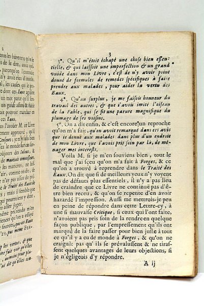 Lettre écrite à M. le 15 Octobre 1696 où il répond à quelques Objections qu'on a faites contre son Livre des Eaux Minérales de Forges.