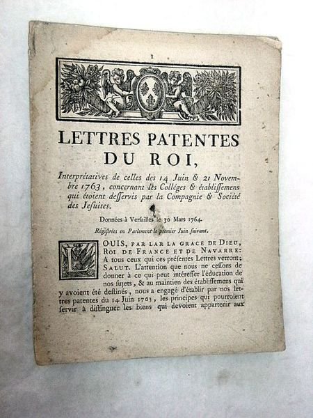 LETTRE PATENTES du roi, interprétatives de celles des 14 juin et 21 novembre 1763, concernant les collèges et établissemens qui étoient desservis par la Compagnie et Société des Jésuites.