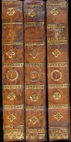 3 voll. in-8° (177x105mm), pp. XXXVIII, 262; 393; (4), 436; legatura coeva p. pelle con titolo e segnatura di volume in oro su doppio tassello e fregi in oro ai dorsi. Tagli marmorizzati. Nota manoscritta del tempo di conferimento dei volumi in premio scolastico. Fioriture. Alcuni restauri ai dorsi. Buon esemplare. Dodicesima edizione, riveduta, corretta e aumentata, della nota opera antivolterriana dell'abate Guenée (Étampes, 1717-Fontainebleau, 1803). L'ecclesiastico francese finge che numerosi ebrei del Portogallo, della Germania e della Polonia indirizzino a Voltaire delle missive al fine di confutare l'interpretazione delle Sacre Scritture fornita da Voltaire nel 'Dictionnaire Philosophique' e nel corpus dell'intera sua opera. Attraverso la finzione letteraria delle lettere degli ebrei, il Guenée intende in realtà, per vie traverse, intessere un'apologia del credo cristiano, esente, tuttavia, da qualsiasi fanatismo. Proprio in virtù della sua moderazione, questo pseudo epistolario venne benevolmente accolto dallo stesso Voltaire, che, scrivendo a D'Alembert, riconobbe al Guenée ingegno non comune. Lo stesso Voltaire, nel 1777, scrisse una replica indirizzata contro la quarta edizione dell'opera del Guenée ed intitolata 'Un Chrétien contre six Juifs'. L'opera ebbe, fra i suoi più illustri estimatori, Chateaubriand. Il Guenée fu professore di eloquenza al Collège du Plessis di parigi (1741-1762), canonico di Orléans, membro dell'Académie des Inscriptions dal 1778. La presente è la sua opera maggiormente conosciuta e significativa. Cfr. Brunet, Table, 1859. Barbier, II, 1260. Cioranescu, 32866.