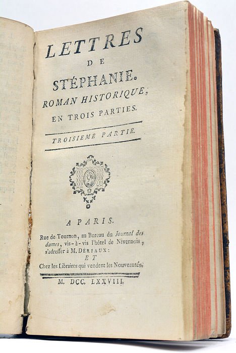 3 parties en 1 volume. 2 feuillets. 200 pages. + 1 feuillet. 255 pages. + 1 feuillet. 230 pages. (17x9,5 Cm). Plein veau. Dos à nerfs orné. Reliure de l'époque usagée. Coiffe manquante. Charnière fendue. Coins émoussés. Taches et rousseurs éparses. Edition très rare de ce roman féministe qui donne le ton, par certains aspects, aux "Liaisons Dangereuses" de Choderos de Laclos parues quelques années plus tard. Fanny de Beauharnais fut une figure intéressante dans les panorama des lettres féminines des Lumières. Son travail s'inscrit dans un mouvement littéraire se qualifiant lui-même de «fugitif». Avec ironie et légèreté, ses vers, épîtres, morales ou contes de fées, dépeignent aussi bien les personnages que la bêtise des hommes, sans parler de celle des femmes. Séparée de son mari, elle se consacra à la littérature qu'elle cultiva avec passion, fut membre de plusieurs académies littéraires et ouvrit un salon rue de Tournon où elle recevait notamment Restif de La Bretonne, Louis-Sébastien Mercier ou Olympe de Gouges. Rareté bien conservée.