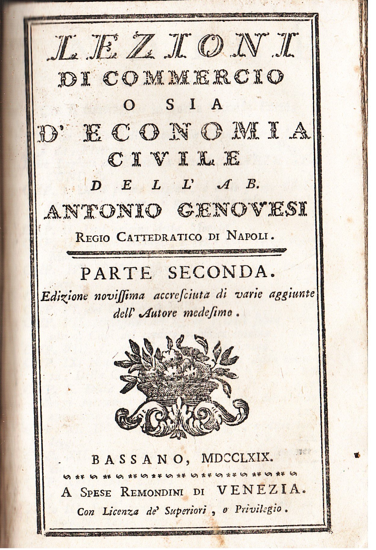 8° (cm. 17 x 11) mezza pelle '800, tit. e fregi oro al dorso, 2 parti in un vol. pp. 355; 260. I due frontesp. con fregi e cornice xilogr. Taglio super. rifilato, alcuni strappetti restaur. nel compl. buon esempl. Seconda edizione (ediz. originale Milano, 1768) delle lezioni tenute da Genovesi (1712-1769) presso la cattedra di Commercio dell'Universita' di Napoli.