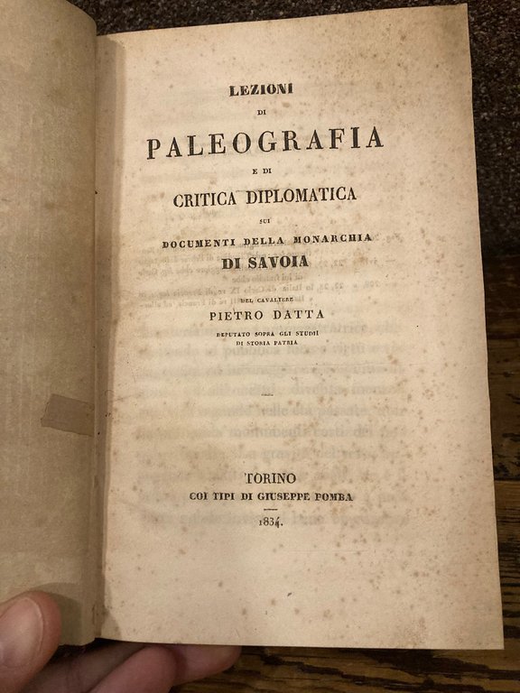 In-8° (200x130mm), pp. XVII, (1), 508, (2), legatura dell'epoca in m. pelle con titolo in oro su dorso a nervetti. In fine, 14 tavv. a p. pagina incise in litografia da Ajello e Doyen di Torino. Le tavole riproducono specimen di antichi documenti sabaudi e di sigilli ad essi apposti. Brossura originale conservata. Fioriture normali, qualche occasionale goretta. Buon esemplare. Prima edizione. Importante testo di paleografia e critica diplomatica sabauda, contenente tutti gli accorgimenti e le tecniche metodologiche richieste al paleografo nello studiare gli antichi documenti, dalla conoscenza del materiale scrittorio a quella dell'evoluzione storica delle grafie (romana, merovingica, carolina, capeziana, tedesco-alemanna, longobardica, gotica, etc.), dall'accentazione alla sfragistica, dalle segnature e dai monogrammi alle competenze più generalmente storico-linguistiche. Uno dei primi saggi italiani di paleografia secondo l'accezione metodologica moderna, non comune. Pietro Luigi Datta, nativo di San Giorgio Canavese (non è certa la sua data di nascita), morto nel 1875 a Padova, fu storico, erudito e paleografo allievo del Vernazza, dal 1822 impiegato nel Regi Archivi. Insieme col Cibrario fu un pioniere nel campo degli studi sul Medioevo in Piemonte. Manca al Manno. Sul Datta, Archivio Biografico Italiano, fiche I, 345, 443.