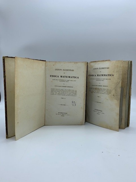 2 volumi in 8 (cm 14 x 22), pp. XIX + (1b) + (4) di errata + (2) + 300 con 6 tavole finali piu' volte ripiegate incise all'acquaforte con figure geometriche; XXII + (2) di errata + 375 + (1b) 6 tavole finali piu' volte ripiegate incise all'acquaforte con figure geometriche. Fioriture sparse e qualche sporadica gora alle pagine. Legatura in mezza pelle coeva con danni riparati al dorso e alle cerniere del I volume. Edizione originale di quest'opera didattica di Ottaviano Mossotti, ricavata dalle note preparatorie manoscritte delle lezioni tenute all'Universita' di Corfu'. Mossotti nacque a Novara nel 1791, si laureo' in matematica e fisica all'Universita' di Pavia dove fu allievo di Alessandro Volta. Nel 1813 entro' all'osservatorio astronomico di Brera, pubblico' un articolo su un nuovo metodo per determinare le orbite dei corpi celesti che gli diede fama internazionale. Nel 1823 il suo nome fu trovato dalla polizia austriaca tra le carte di Alexandre Philippe Andryane inviato in Italiana dal rivoluzionario Filippo Buonarroti con lo scopo di rinfocolare la cospirazione patriottica. Per sfuggire al carcere, Mossotti ando' prima in Svizzera, poi a Londra e a Buenos Aires, dove lavoro' per il Dipartimento topografico e insegno' Fisica all'Universita'. A causa dei trascorsi politici, nonostante i suoi meriti scientifici, non riusci' a in Italia, ando' quindi a Corfu' dove insegno' matematica nella locale Universita'. Rientro' quindi in Italia, fu chiamato all'Universita' di Pisa, partecipo' nel 1848, all'eta' di 57 anni, alla battaglia di Curtatone. Mori' nel 1863. Fra le sue ricerche piu' importanti si segnalano quelle nel campo della fisica molecolare, della teoria ondulatoria, della polarizzazione e del magnetismo.