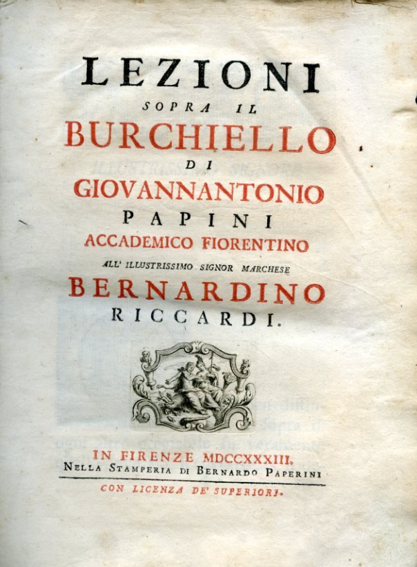 In-4° antico (228x68mm), pp. (2), XXXIV, 236, legatura coeva p. pergamena con titolo e fregi in oro su tassello in pelle nera posto su dorso a nervetti. Tagli a spruzzo rossi, frontespizio in rosso e nero con vignetta allegorica in calcografia. Un ritratto f.t. del Burchiello inciso su rame tra le pp. X-XI, tratto da quello conservato nella Pinacoteca medicea. Testatine, capilettera e finalini figurati ed ornati incisi sia su rame (nella dedicatoria al Marchese Bernardino Riccardi e nell'indice) che su legno (nel restante testo). Indici e approvazioni finali. Bell'esemplare, con solo qualche leggera fioritura e brunitura. Al contropiatto anteriore, piccolo ex-libris monogrammato a rilievo del XIX secolo ed annotazioni antiche afferenti al volume, di due distinte mani, una presumibilmente coeva e l'altra chiaramente ottocentesca. La prima recita: 'L'indicaz. di tomo primo, che sta sull'antiporta, mostra che il Papini aveva in animo di continuar l'opera, il che non fu poi seguito'. Nella seconda annotazione si dice: 'Le dodici lezioni sopra il Burchiello di Gio. Antonio Papini, sono pregevolissime sì per essere scritte con purità di lingua, come per contenere belle osservazioni e scoperte intorno alla toscana favella'. Edizione originale del tomo primo, ed unico pubblicato, di questa bella illustrazione critica dei sonetti burleschi del celebre 'Burchiello' (poetare 'alla burchia' significava verseggiare in modo bizzarro e senza nessi apparenti tra le immagini), al secolo Domenico di Giovanni (Firenze, 1404-Roma, 1448), di considerevole interesse sia come primo serio inquadramento critico della poesia di tale autore sia per la congerie di osservazioni linguistiche che in essa è contenuta (l'opera fece parte dei testi di lingua della Crusca). Gamba, 259, note. Razzolini-Bacchi della Lega, 260:'Fu l'unico pubblicato'.