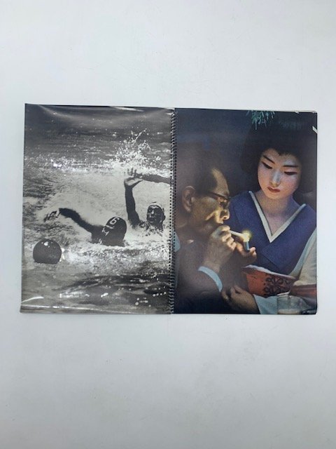 In 8 (cm 19 x 26,5), 8 fogli in cartoncino preceduti da foglio plastificato con illustrazione a stampa. Spirale plastificata al dorso. Pubblicazione rivolta agli inserzionisti pubblicitari in previsione dell'uscita dei numeri della rivista Life, nelle versioni in inglese e spagnolo, in occasione dei giochi olimpici di Tokyo del 1964. Testo in inglese in cui si danno informazioni circa le date utili finali per l'invio di pubblicita' a colori e in bianco/nero per essere inserite nei numeri di imminente pubblicazione. Belle riproduzioni fotografiche con gioco di sovrapposizione tra l'immagine stampata sul foglio plastificato trasparente che si proietta sul foglio successivo.