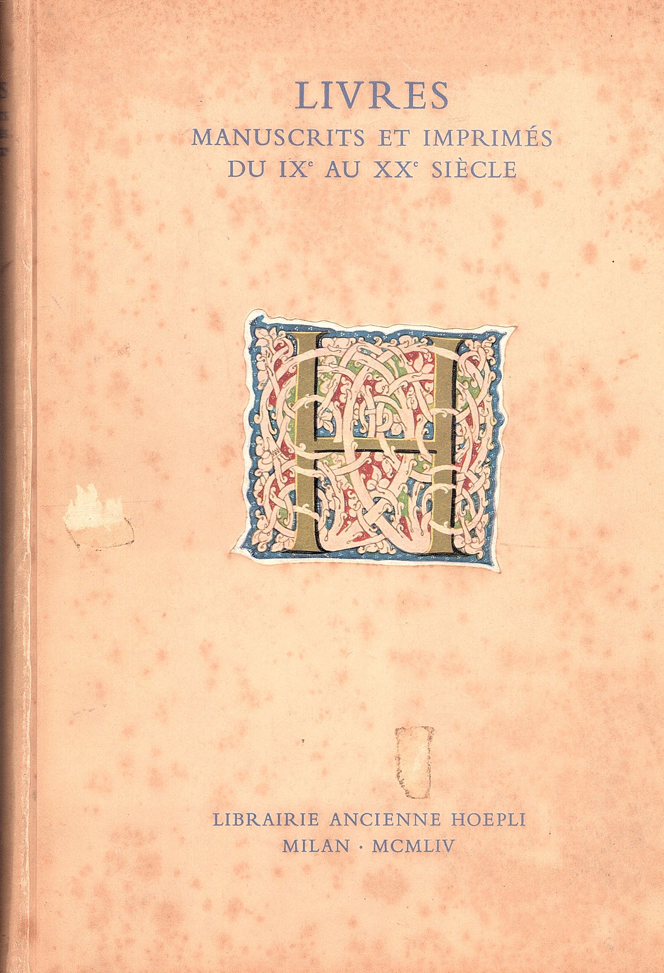 In-4° piccolo, pp. (8), 161, (1), cartonatura editoriale imitante la pergamena con titolo impresso in azzurro al piatto e al dorso e, al centro dei piatti, riproduzione policroma di un'antica iniziale ornata. 70 tavv. f.t., di cui 68 in b.n. e 2 applicate a colori. Fioriture a talune pp., ma ottimo esemplare. 203 schede catalografiche, di manoscritti, disegni, incisioni, libri a stampa dal XV al XX secolo. La scheda n. 64 descrive un raro globo terrestre di Coronelli del 1688 commercializzato nel 1954 dalla Libreria Hoepli (il mappamondo è riprodotto alla tav. XXVI).