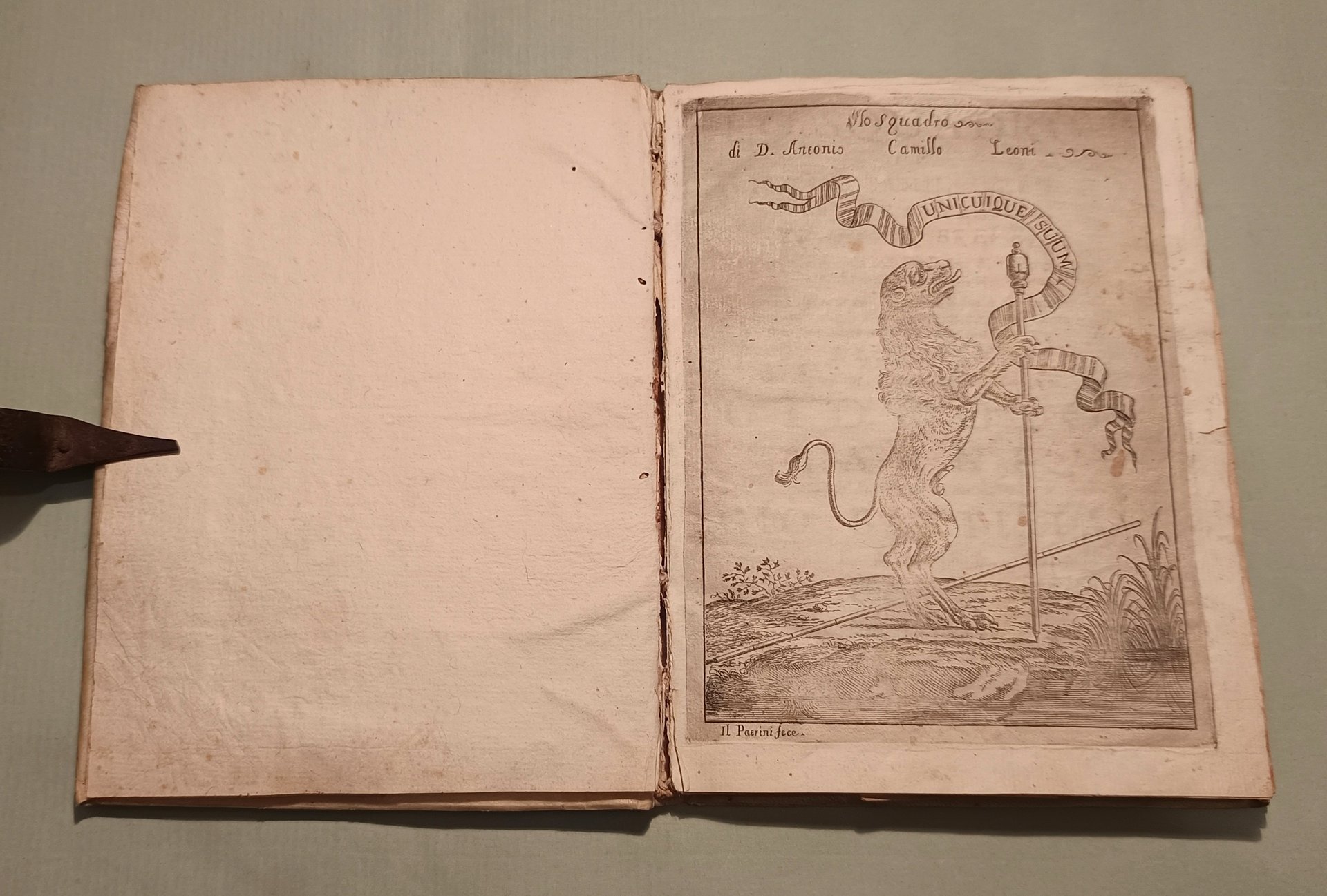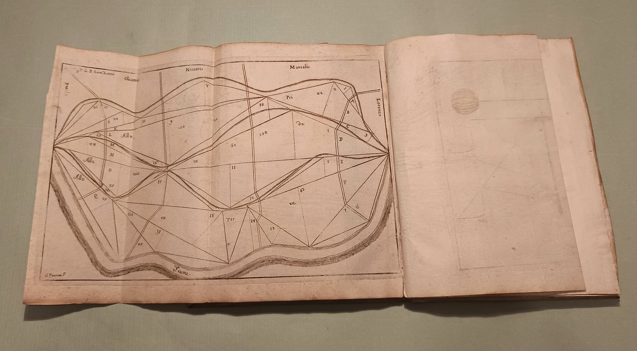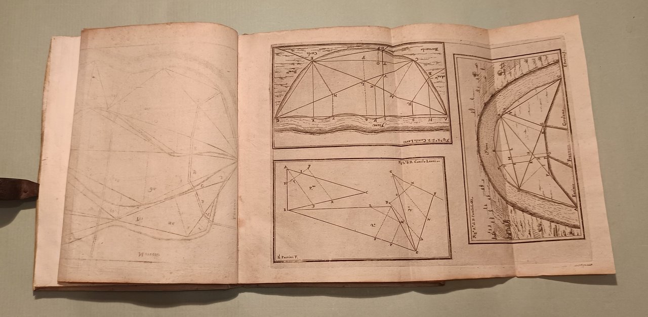 In Parma, per Alberto Pazzoni e Paolo Monti, 1699. In 8vo (cm.21x16); cc.4 n.nn., pp.47. Antiporta figurata. 7 tavole. Capilettera figurati. Pergamena coeva. Riccardi I, 33: "E' un breve trattatello di agrimensura fondato sull'uso dello squadro. L'autore si occupa ancora della divisione delle alluvioni, delle difese dei fiumi e delle misure delle acque, in modo affatto elementare"; Olschki, Choix de livres anciens rares et curieux VI, 7206. Edizione originale assai rara.