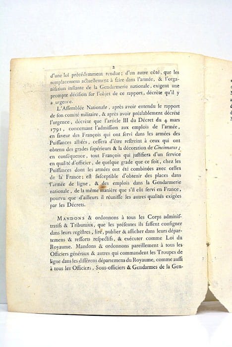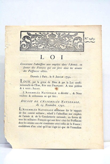 3 pages. (24x19 Cm). Dérelié. Loi affirmant l'admission aux emplois de l'armée, en faveur des français qui ont servi dans les armées des puissants alliées.