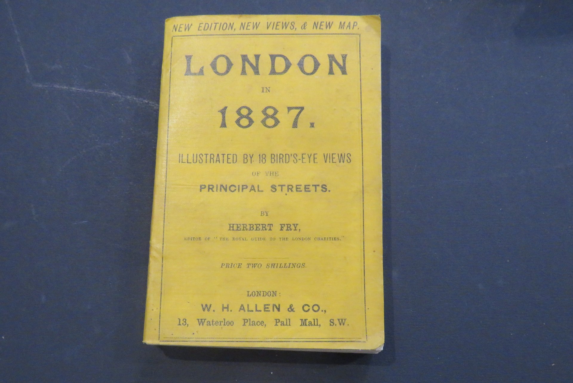 London, W. H. Allen & Co., 1887. In -16 (mm. 120,2x180), pp. 264 [I-VIII "Advertiser"], con 18 tavole ripiegate in nero fuori testo, vedute panoramiche 'a volo d’uccello' delle principali strade di Londra, con gli edifici più rappresentativi e 1 mappa ripiegata più volte, in nero fuori testo, che mostra i principali sobborghi e i dintorni di Londra. Brossura editoriale con titolo, autore ed editore in cornice in nero al piatto anteriore, illustrata in nero al piatto posteriore, da una pubblicità "Pears’ Soap". Prefazione di Herbert Fry, curatore della 'Royal Guide to the London Charities', 'Handbook to Normandy', 'The Road to Paris', etc. "New Edition, New Views, & New Map". Edizione rivista e ampliata. Ottimo.