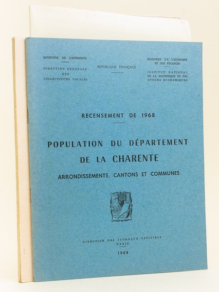 [ Lot de 2 volumes relatifs au recensement ou à la démographie de la Charente ] Population par Commune de 1821 à 1954. Département de la Charente [ Avec : ] Recensement de 1968. Population du Département de la Charente. Arrondissements, Cantons et Communes.