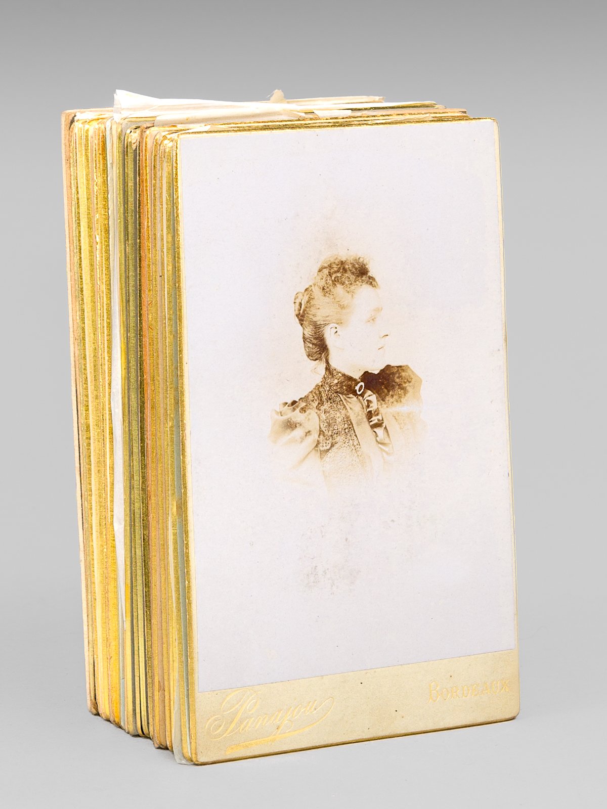 26 photographies montées sur cartons format 16,3 x 10,3 cm avec adresse des photographes au verso : Panajou, 6 & 8 Allées de Tourny : 1 photo ; H. Hénault, 17 avenue Thiers, Bordeaux Bastide (vers 1899-1900) : 3 ; G. Pradeaux, 10 rue Sicard (vers 1892-1908) : 2 ; Charles Chambon, 56 Allées de Tourny (vers 1898-1925) : 2 ; Henry, 7 Cours de l'Intendance (1898-1903) : 1 ; L. Coutenceau, 133-135 rue Sainte Catherine (1896-1943) : 1 ; Léon Artigue, 3 Place de la Comédie (1887-1899) : 1 ; Ernest Forest, 53 Cours d'Aquitaine (1862-1910) : 1 ; Juan de Parada, 25 Allée de Tourny (1860-1875) : 1 ; E. Freudenberg, 19 rue Sainte Eulalie (vers 1901-1903) : 1 ; A. Gary, 118 rue Sainte Catherine (1904-1911) : 1 ; A. Terpereau, 30 Cours de l'Intendance ( 1891-1897) : 6 ; F. van den Bosch, 12 rue Sainte Catherine (1875-1897) : 2 ; Marrot Mannot, 86 rue Saint Genès (1906-1908) : 3 Très intéressant lot de portraits (dont un portrait mortuaire) par des photographes bordelais. Les dates précisées ci-dessus correspondent au dates d'activités de chaque photographe à ces adresses, telles que signalées dans l'excellent ouvrage de Pierre Bardou : "Photographes en Gironde". La grande majorité de ces clichés doivent dater des années 1880-1905. Prix du lot, non séparable.