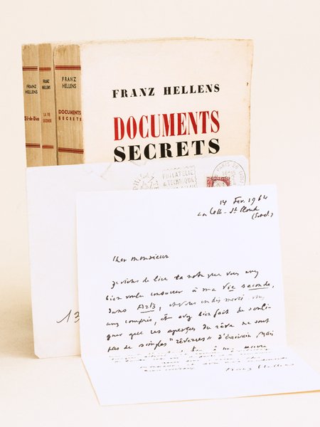 Rappel du titre complet : [ Lot de 3 livres dédicacés par l'auteur, auxquels on joint un belle lettre autographe signée ] Documents secrets - La vie seconde - Oeil-de-Dieu Avec une LAS : "Je viens de lire la note que vous avez bien voulu consacrer à ma "Vie Seconde" dans Arts, et vous en dis merci. Vous avez compris, et avez bien fait de souligner que ces aperçus du rêve ne sont pas de simples "rêveries" d'écrivain, mais une sorte d'introduction à une oeuvre presque achevée, et comme l'éclairage de toute une vie de poète et de romancier". Bel ensemble d'ouvrage tous dédicacés par l'écrivain belge Franz Hellens (à François Erval, à Jean Lemarchand "cette poursuite d'une vie fugitive, surréelle", et à l'écrivain et critique Michel Desbruères "heureux de savoir qu'il a aimé Mémoire d'Elseneur". On joint une LAS à ce dernier, datée de février 1964 : "Je viens de lire la note que vous avez bien voulu consacrer à ma "Vie Seconde" dans Arts, et vous en dis merci. Vous avez compris, et avez bien fait de souligner que ces aperçus du rêve ne sont pas de simples "rêveries" d'écrivain, mais une sorte d'introduction à une oeuvre presque achevée, et comme l'éclairage de toute une vie de poète et de romancier". Prix du lot, non séparable.
